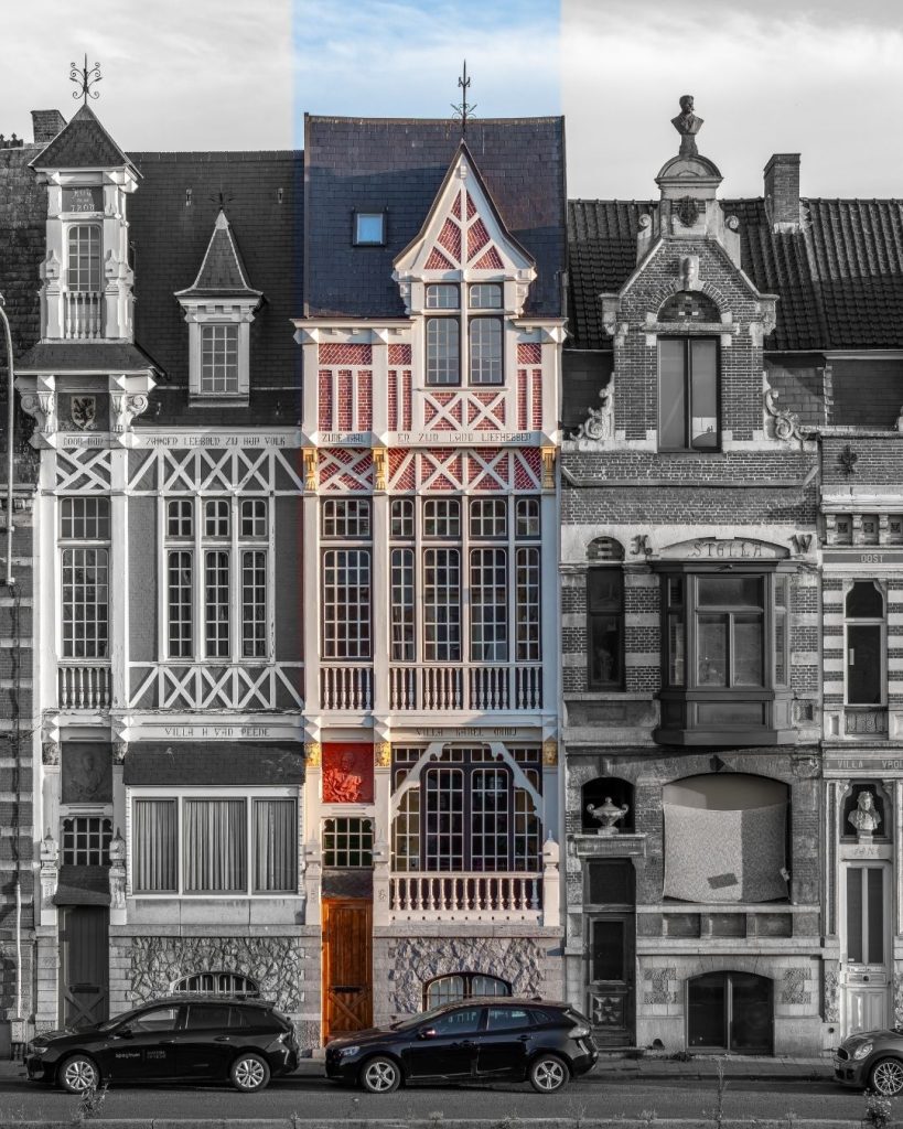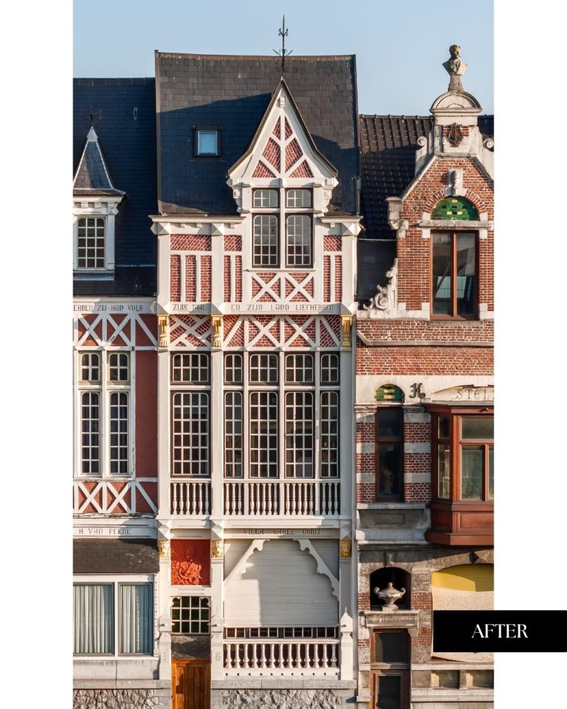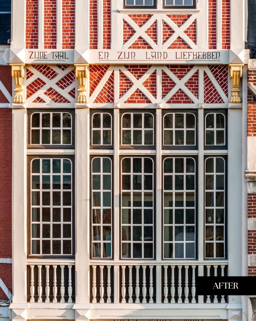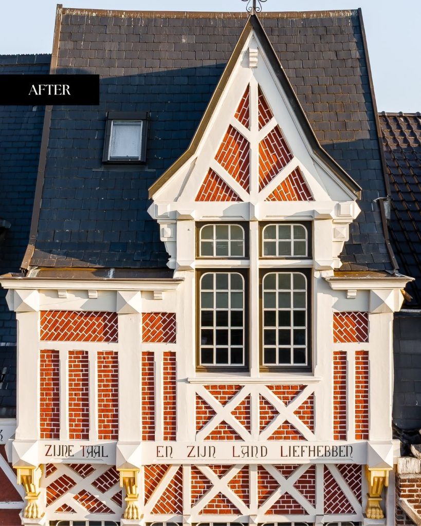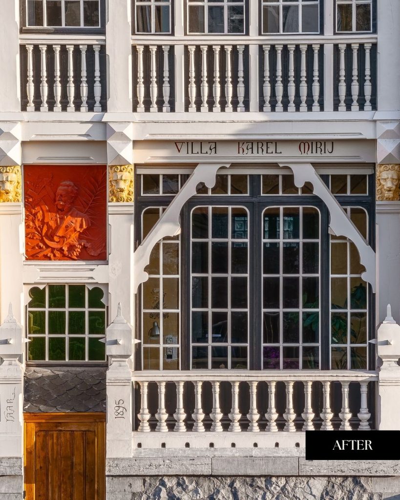 Een uitvoerige kleurstudie bracht de originele tinten aan het licht. Dankzij deze voorbereiding kon de woning niet alleen structureel hersteld, maar ook visueel trouw aan haar geschiedenis gereconstrueerd worden. De zachte glans en genuanceerde kleuren geven de gevel opnieuw haar statige karakter.