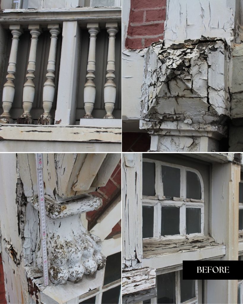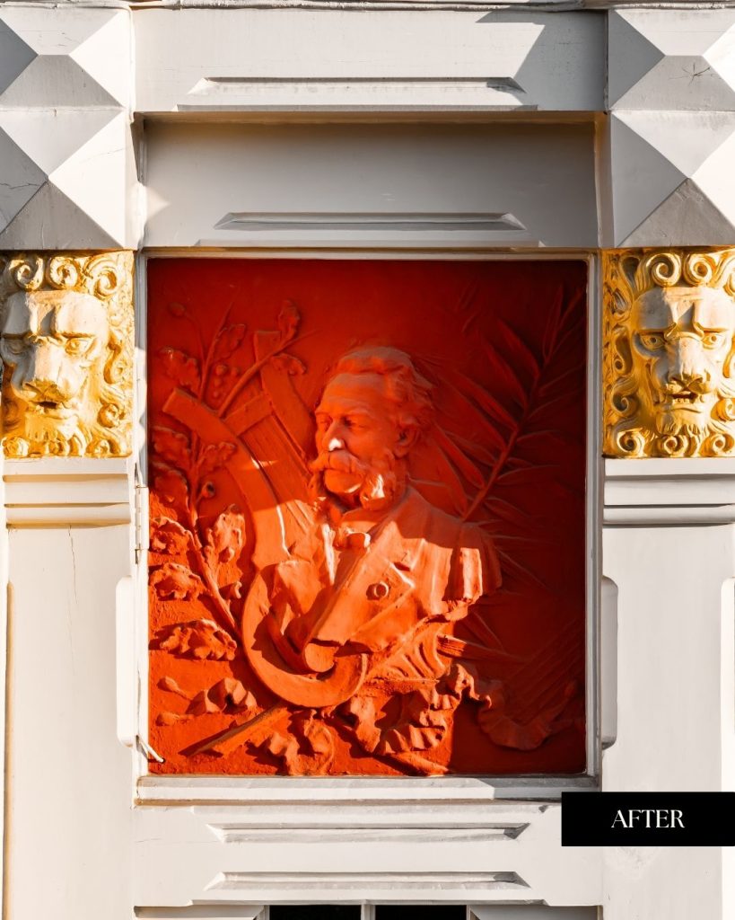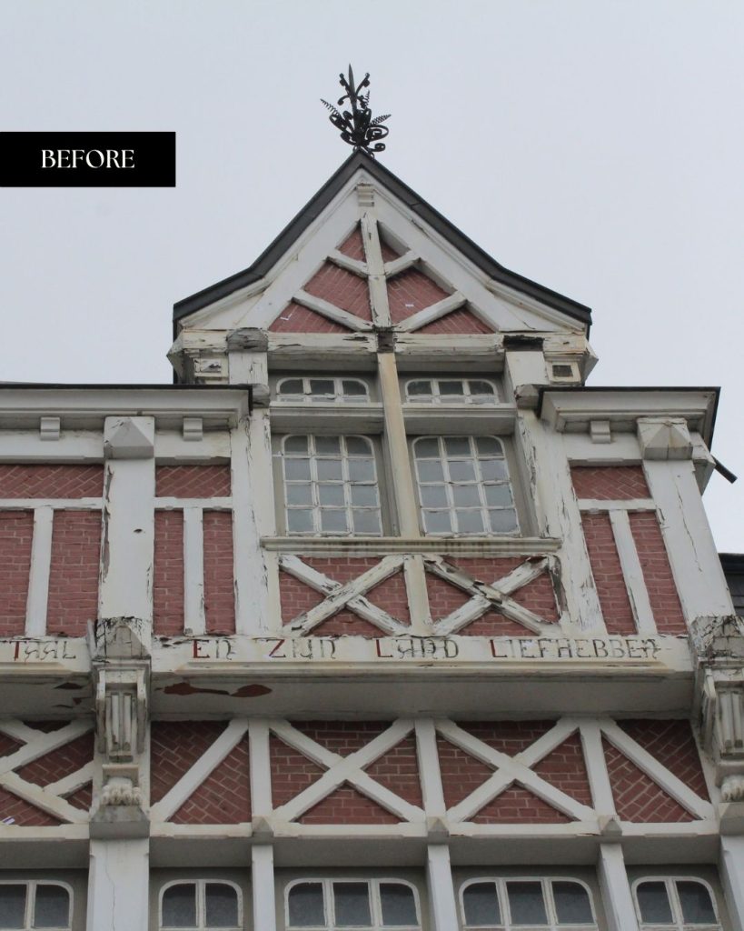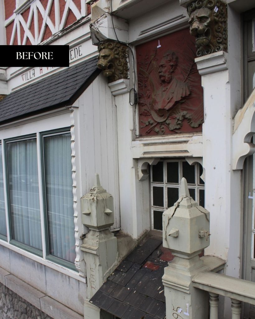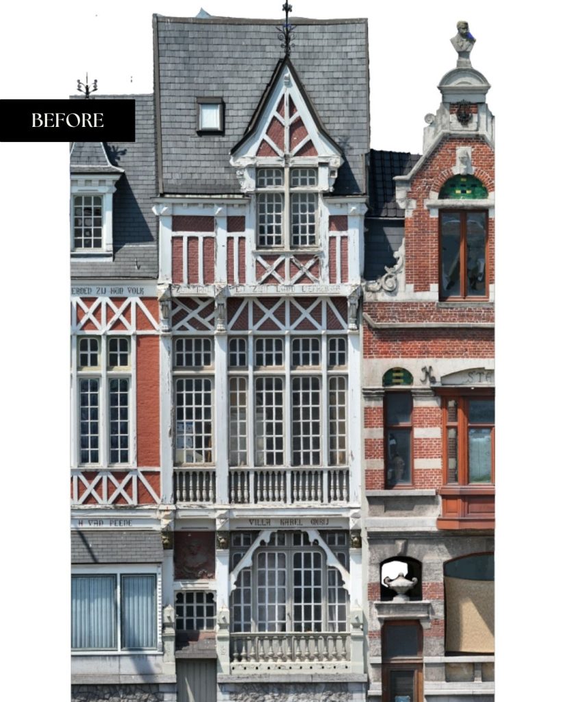 De gevel vertoonde ernstige schade: waterinsijpeling, houtrot, roest en verzakkingen hadden hun sporen nagelaten. Elk element, van kroonlijsten tot gevelletters, werd minutieus hersteld met authentieke technieken en duurzame materialen. Houtwerk en smeedijzer werden gereinigd, behandeld en opnieuw afgewerkt met zorgvuldig gekozen, hedendaagse producten die de duurzaamheid verzekeren in functie van het huidige klimaat en de luchtverontreiniging. Zelfs de leeuwenkoppen werden in het atelier van Tony Baert met de hand gerestaureerd.